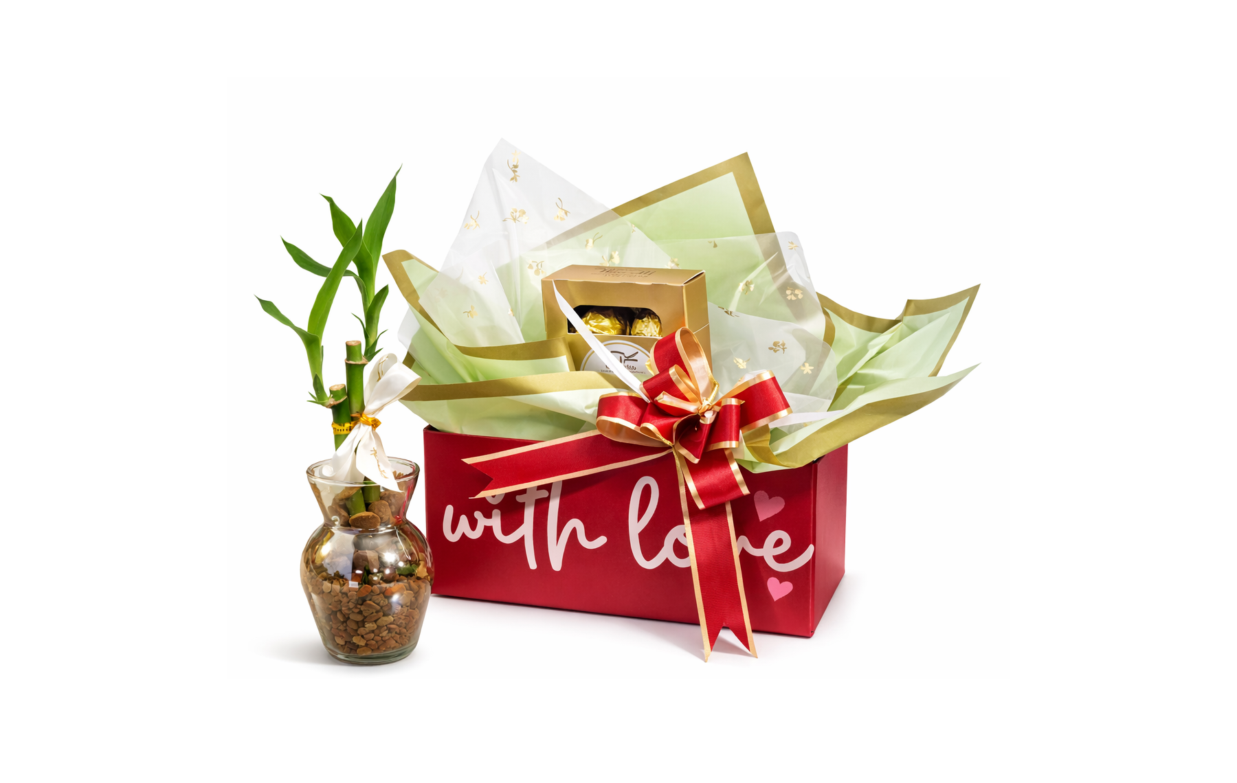Transforme o dia de alguém especial com o nosso exclusivo arranjo com Bambu da Sorte. Cuidadosamente preparado para encantar e surpreender com muito amor, esse kit traz uma linda caixa com detalhes dourados e o apaixonante tom vermelho, com a frase With Love (com amor).