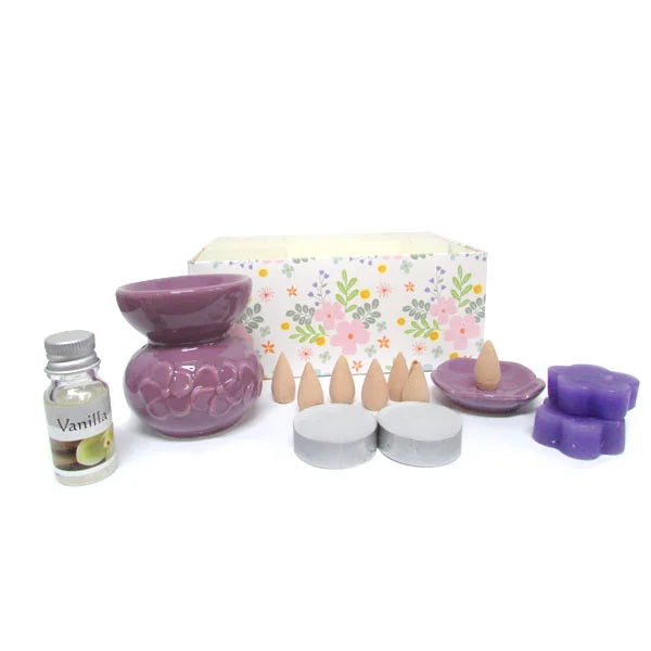 Transforme o seu ambiente em um refúgio de aconchego e boas energias com o Kit Presente Rechaud de Cerâmica Lilás com Essência de Baunilha, Incensário Flor, Sabonetes, Velas e Incensos Cone.